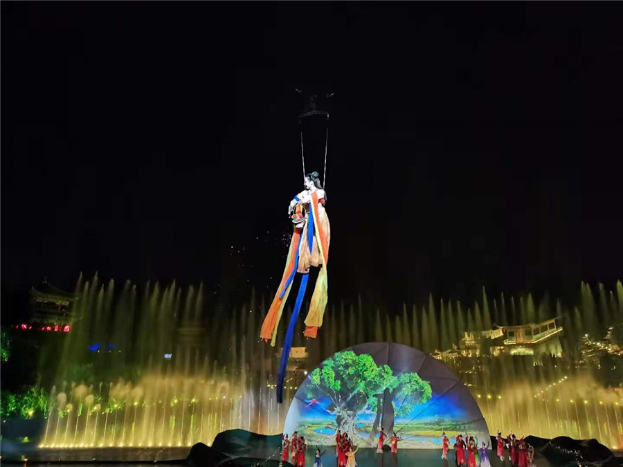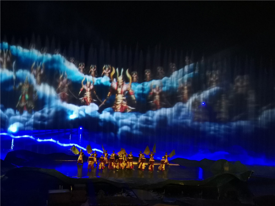 此外,还有水幕投影辅助。在水幕或水帘上投射影像,展现出更梦幻、更宏大的背景效果,营造出裸眼3D的视觉效果,让观众拥有如梦似幻的震撼视听体验。随着剧情进行,利用3D非等边威亚系统,演员可以抵达舞台内外的任意地点,在空中做出复杂的特技运动。