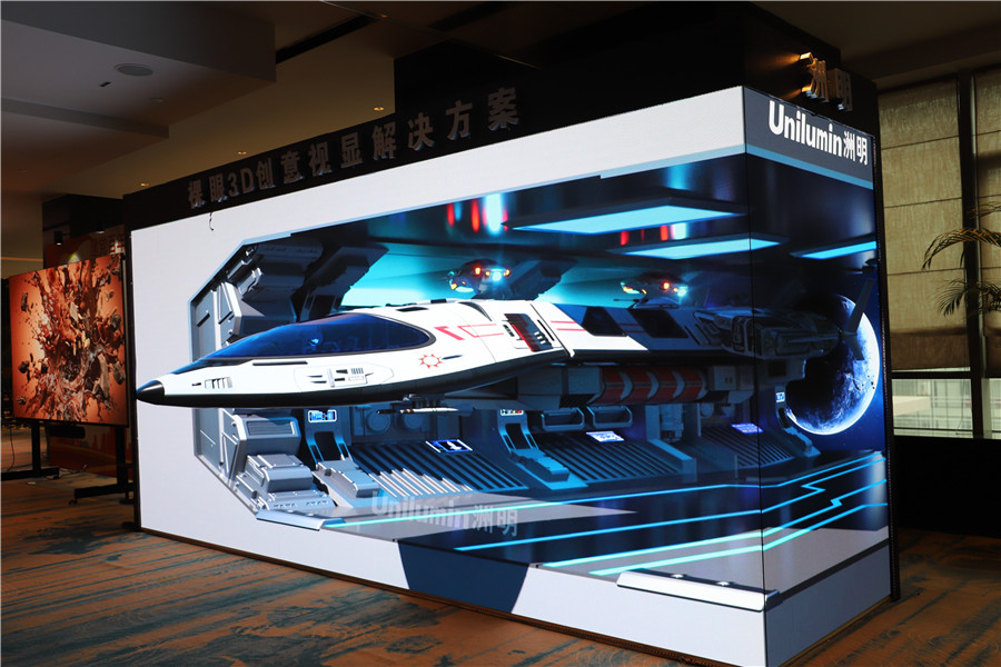 走进展馆,映入眼帘的便是洲明科技的互动展示体验产品。这是由三块约5米宽2米高的互相垂直LED大屏构成的XR(混合现实)沉浸式虚拟场景,现场展示了直升机场景和丛林场景,参观者站上去用手摸直升机、动物或流水,拍摄出来便是人与场景完美融合,宛如现实场景,目前这项技术已经应用于影视拍摄中。而在另一个展区,洲明科技的裸眼3D大屏正在播放宇宙飞船出航场景,在不佩戴3D眼镜的情况下,利用视觉错位效果,便感觉到宇宙飞船似乎要飞出屏幕。