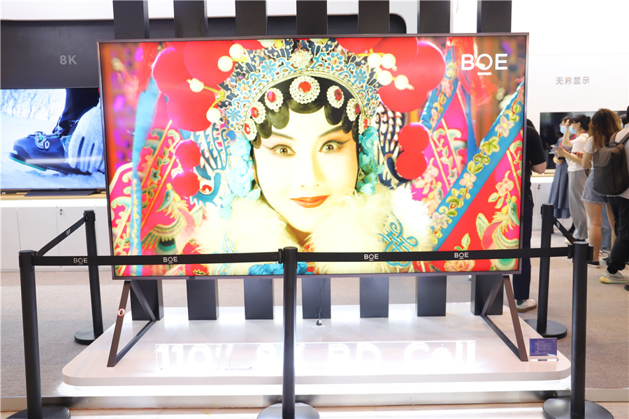 京东方展示的110英寸8K 120Hz BD Cell产品格外引人注目,在分辨率、对比度、色深、刷新率上表现突出。另一款Mini LED COG玻璃基直显产品将纯黑态、无屏闪、全灰阶拟合等关键技术发挥到极致。