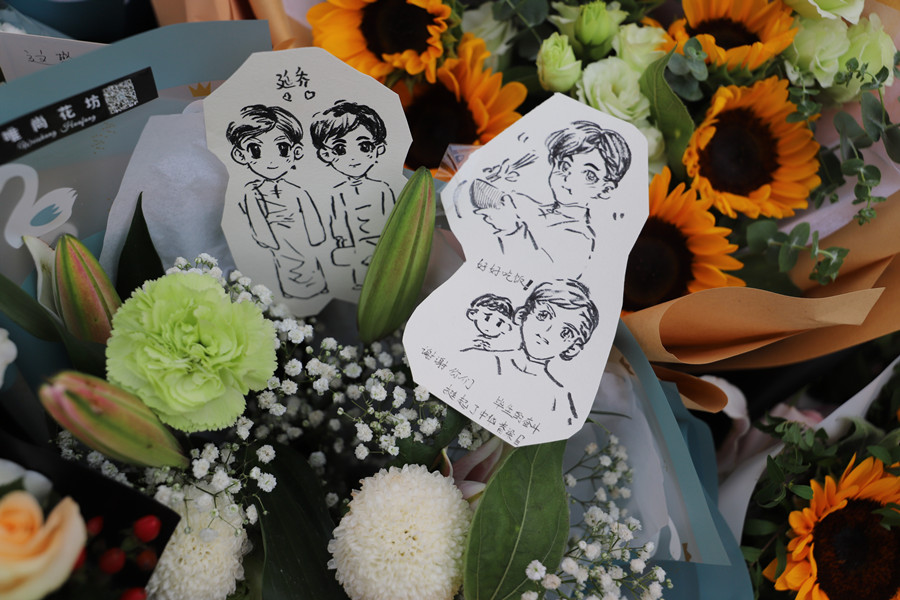 在延乔路路牌下,摆满了向日葵、菊花、玫瑰、百合、康乃馨……花香袭人,国旗、党旗、红领巾、留言等点缀于鲜花丛中,甚至还有北京航空航天大学信纸折成的纸飞机,这些无一不寄托着大家的怀念和崇敬之情。“感谢先辈在黑暗中不断寻求救国之路。”“这盛世如您所愿!向革命先烈致敬!”“你们没能看到的新中国,我们替你们看!”这一句句热诚真挚的留言令人热泪盈眶。在一幅画着陈延年、陈乔年的卡通画上写着:“谢谢你们毕生的奋斗,挺起了中国脊梁!”安徽医科大学的中共预备党员董思睿写了一封长信,向两位烈士承诺:“请您放心,强国有我!”