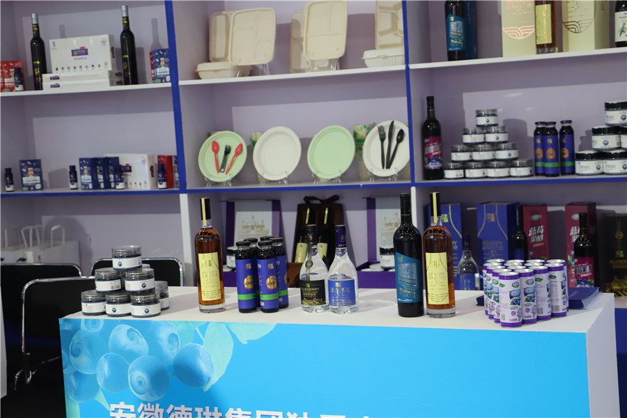 怀宁县的蓝莓综合展区展出的是蓝莓酒、蓝莓复合液、蓝莓花青素、蓝莓果醋等产品。为大力发展蓝莓产业,怀宁县引进浙江蓝美、上海昌荣等38家企业落户,着力于蓝莓种植、加工、花青素萃取及化妆品、保健品等高端衍生产品生产。目前,以蓝莓为核心,怀宁县形成包括良种繁育、规模种植、预冷保鲜、食品加工、休闲农业、乡村旅游等产业、业态,实现三产融合。蓝莓产业已成为县域经济支柱性主导产业,在乡村振兴、经济发展中发挥显著作用。