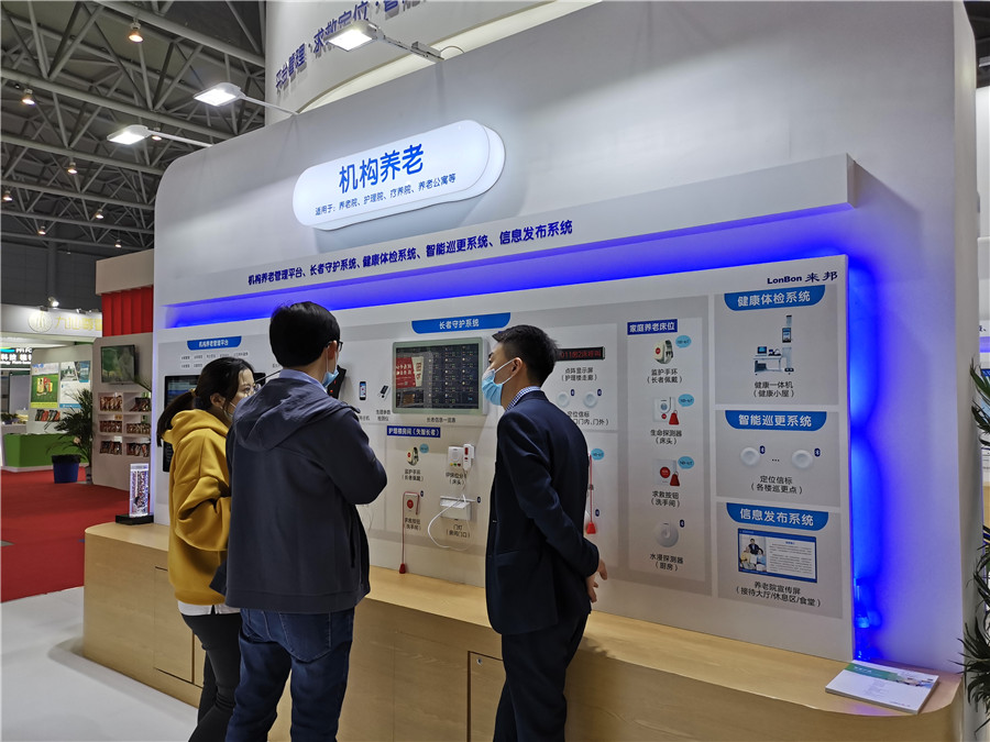 来邦科技股份公司的养老产品涵盖政府特困养老、社区养老、机构养老三大部分,包括养老管理平台、长者监护系统、智能巡更系统、健康体检系统、村嫂服务系统等,可以实现健康管理、安全守护、照料服务、子女远程守护等功能。其中,长者监护系统是监护长者安全的基础。“通过智能化技术及产品的应用,能实现手动报警定位和自动报警定位,还能实现体征数据智能采集、分析与管理,实现对长者24小时不间断监护。”现场工作人员毛克明介绍。