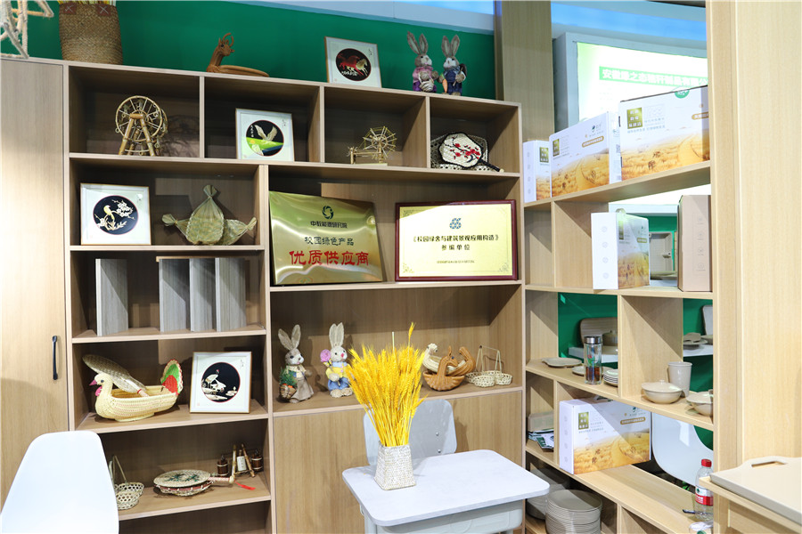 安徽同心林塑胶科技有限公司展出了凉亭、桌椅等秸秆板材制品。“这种板材具有零甲醛、防水阻燃、防腐蚀等优点,可应用在室内装修、家具等领域。”该公司负责人陈锐介绍,“我们是第一次参加秸博会,希望能让更多人了解到这种板材。”