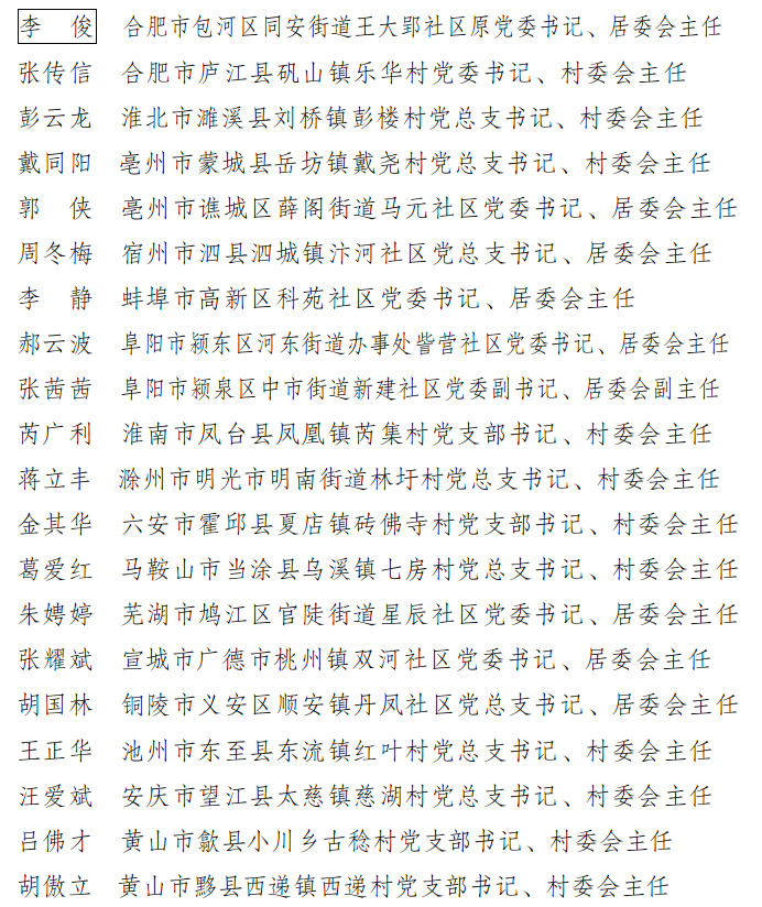 本网讯(记者 史洪芳)5月26日,记者从省民政厅获悉,经组织推报、专家评审、研究决定,2021年度安徽省“最美城乡社区工作者”评选结果公布,合肥市包河区同安街道王大郢社区原党委书记、居委会主任李俊等20位同志被推选为2021年度安徽省“最美城乡社区工作者”。