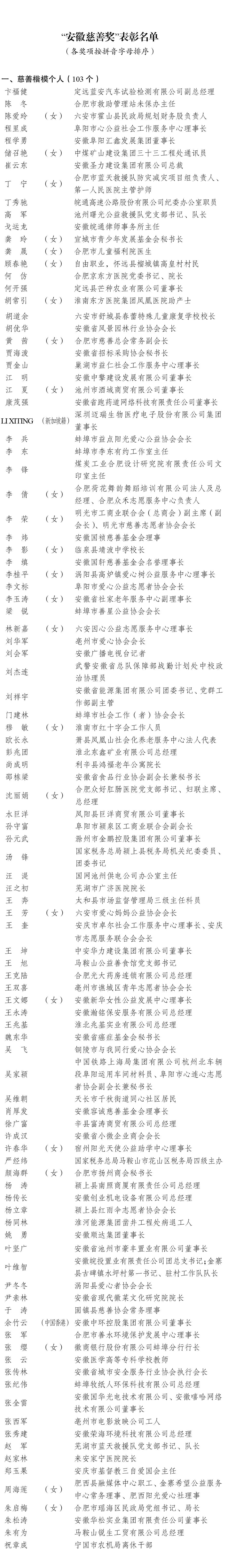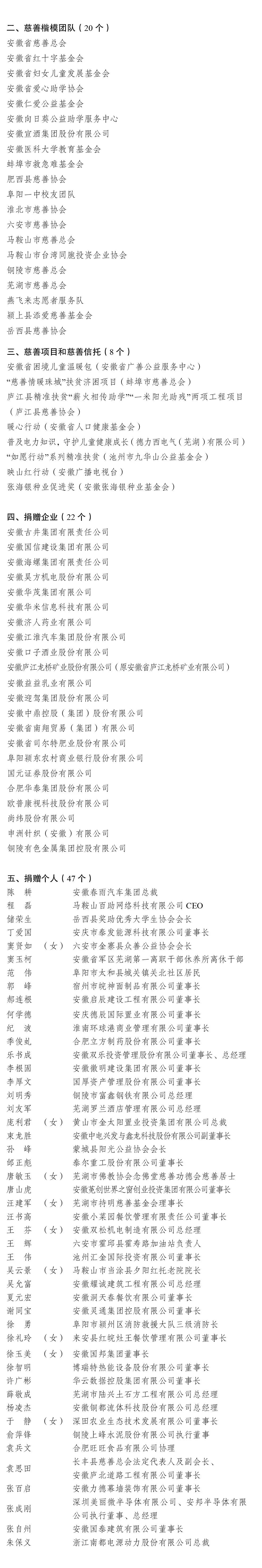 为表彰慈善领域的先进典型,经省委、省政府批准,安徽省民政厅开展“安徽慈善奖”评选表彰活动,经有关方面推荐、评委会审议、征求相关部门意见、社会公示等程序,安徽省民政厅决定授予卞福健、安徽古井集团有限责任公司等200个慈善楷模、慈善项目和慈善信托、捐赠企业、捐赠个人“安徽慈善奖”。