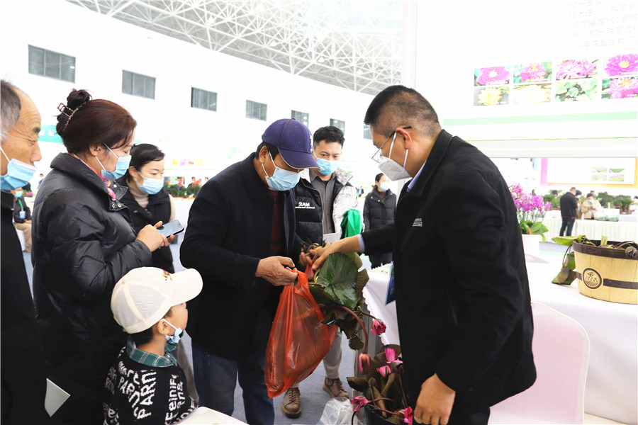 映日荷花科技开发有限公司展示的荷花销售火爆。该公司源于1979年创建的柳家花园,多年坚持走荷花栽培技术创新、杂交育种创新之路,在黄淮平原旱地创建了230多亩观赏荷花育种基地,研发培育的荷花新品种有26大系列2600多个品种,在栽培模式、花冠颜色形态、花瓣数量等11个方面实现突破。公司年产丰花型盆栽观赏荷花30多万盆,年产观赏睡莲、水生鸢尾等宿根水生花卉300多万株,年产值1000多万元,产品销售到30多个省区市,部分种苗远销到韩国、日本、美国及东南亚国家和地区。