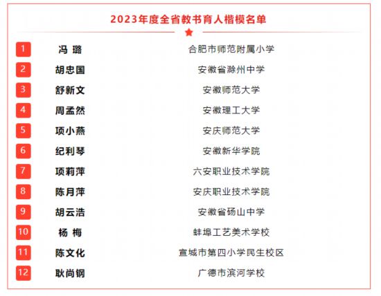 据安徽省教育厅微信号9月10日消息,在各地各校自下而上、逐级审核推荐的基础上,省委教育工委、省教育厅经研究决定:合肥市师范附属小学冯璐等12名教师为2023年度全省教书育人楷模。名单如下
