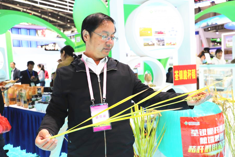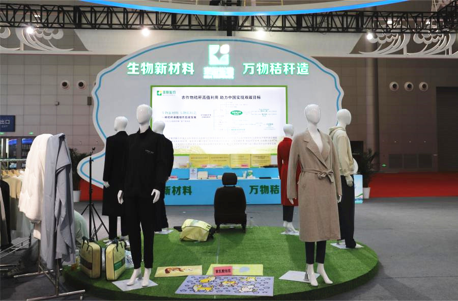 “生物新材料 万物秸秆造”,这是安徽丰原集团有限公司喊出的口号,服装、餐具、皮革椅、口罩、墙板……展厅内秸秆制品琳琅满目。其中,该公司带来了秸秆制糖和生物基材料工程最新科技成果——“秸秆混合糖联产黄腐酸高效有机肥技术”,国内首个年处理1.5万吨级秸秆制糖联产有机肥项目正在运行。现场工作人员陈雨介绍,该公司计划以分布式乡镇糖厂的模式,在乡镇建立混合糖和有机肥加工厂。“每8至9吨农作物秸秆作为原料,可以生产3吨混合糖,同时联产5吨黄腐酸高效有机肥。”这种有机肥可以用于种植蔬菜、水果等,还可改善土壤。此外,混合糖生产聚乳酸至聚乳酸下游应用等产业链集群发展,延伸出塑料加工、纺织、工业及家用装饰材料、生物化学品、生物燃料、生物肥料等六大产业集群。