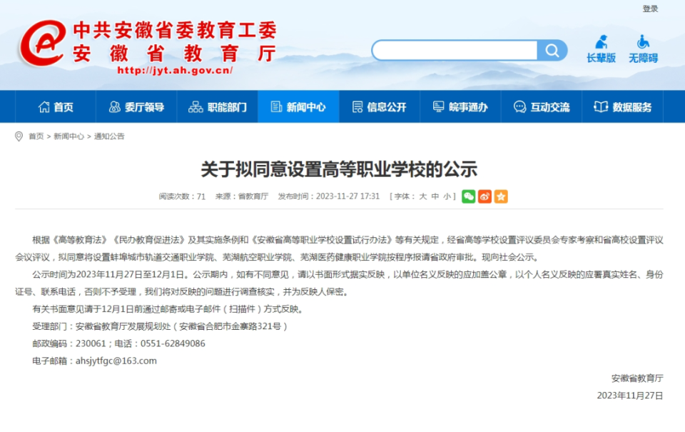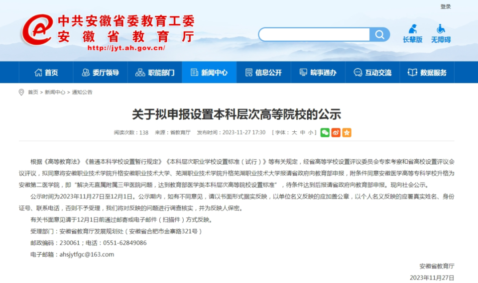 11月27日,据安徽省教育厅官网显示,我省拟同意新设置三所高等职业学校。