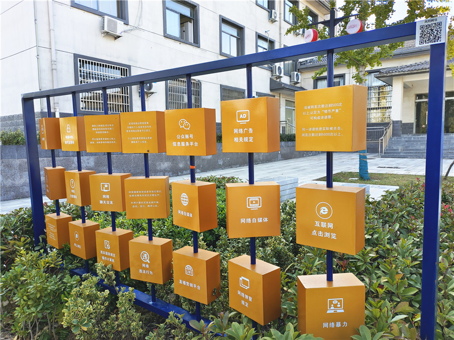 “普法内容没有文字堆砌,而是以各种简单造型营造氛围。”相关负责人告诉记者,为达到最大宣传效果,对与小岗学校仅一墙之隔的凤阳县网络普法主题广场花了很多心思设计。记者看到,有的展板是方块翻转,网络诈骗、网络个人信息等简洁文字翻转到背面便是相关法律知识;有的展板上设置了二维码,里面有各种普法图片、视频、动漫,增加了趣味性。据悉,学生上下学、家长接送学生都要经过,可以在日常生活中潜移默化地让法律知识入脑入心。“只要大家愿意看了,就起到宣传效果了。”在主题广场旁边还矗立着一座小岗村法治文化教育馆,该馆集体验性、参与性、互动性为一体,两者形成室外室内普法宣传搭配。