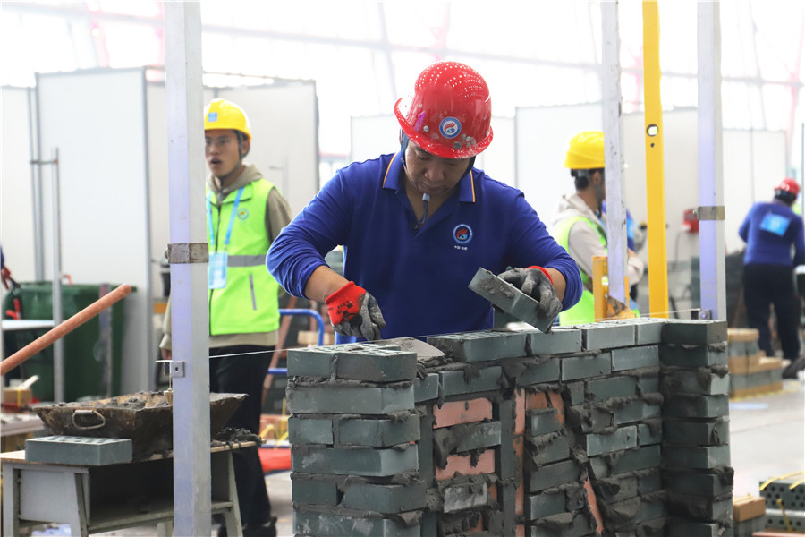 砌筑工赛区,选手们全神贯注地进行比赛,手法娴熟地抹上灰浆,拿起砖块稳稳地放置并抹平,一道道工序有条不紊。经过他们的妙手,一面花式墙面便呈现在人们眼前,在保证速度的同时也保证了精确度。而管工、钢筋工、防水工、建筑信息模型技术员赛项同时开赛,同样精彩纷呈。