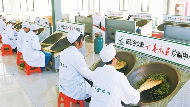 4月18日,金寨县花石乡茶产业扶贫车间工人们正在加工春茶。近年来,花石乡以特色产业为依托,大力实施产业扶贫,带动贫困户发展休闲民宿、农家乐等乡村旅游,助农增收。本报记者 李博 摄