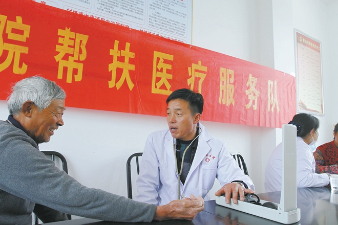 近日,蒙城县王集乡界沟村医务人员为村民测量血压。该县组建由基层卫生计生人员组成的帮扶医疗服务队,深入村组宣传健康扶贫政策,开展医疗帮扶巡诊,为重点贫困人群及时提供医药医疗咨询以及健康体检等服务。本报通讯员 胡卫国 摄