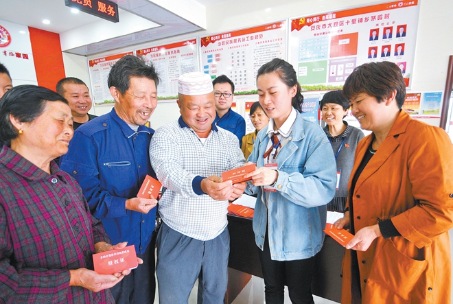 近日,在安庆市大观区十里铺乡茅岭回民村便民大厅,村民们高兴地领到股权证。本报通讯员 黄有安 项顺平 摄