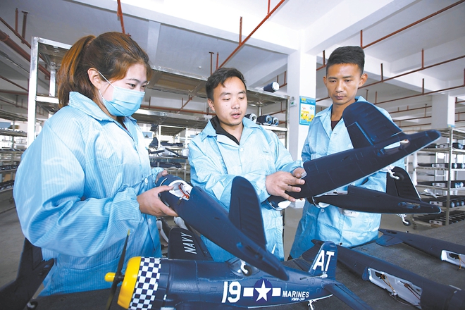 4月25日,蒙城县永腾微行掌智能科技有限责任公司员工在生产航模。这批10余个品种的航模将从今年5月开始分别出口到新加坡、日本、美国等国家。本报通讯员 胡卫国 摄