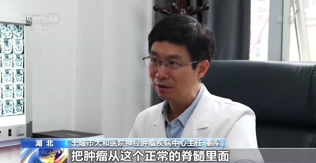 十堰市太和医院神经肿瘤疾病中心主任 秦军:我们花了整整6个小时,把肿瘤从正常的脊髓里面还有正常的血管里面一点点剥离出来,把正常的脊髓和血管保护得非常好。