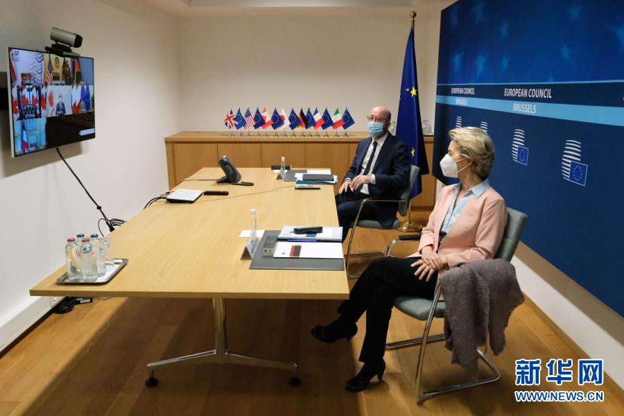 2月19日,在比利时布鲁塞尔的欧盟总部,欧洲理事会主席米歇尔(左)和欧盟委员会主席冯德莱恩出席七国集团领导人视频会议。新华社发(欧盟供图)