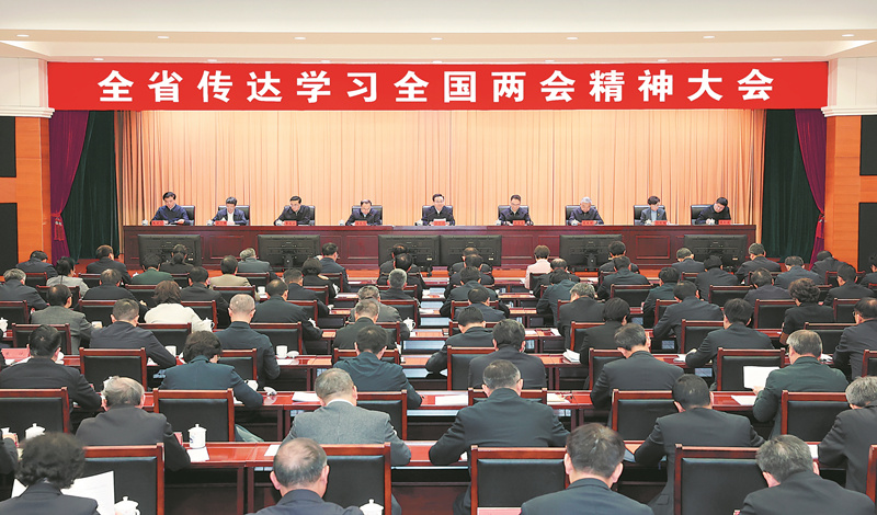 3月13日下午,省委召开全省传达学习全国两会精神大会。省委书记梁言顺传达习近平总书记在全国两会期间的重要讲话精神,部署我省贯彻落实工作。记者 杨竹 许昊 摄 (记者 李浩)3月13日下午,省委召开全省传达学习全国两会精神大会。省...
