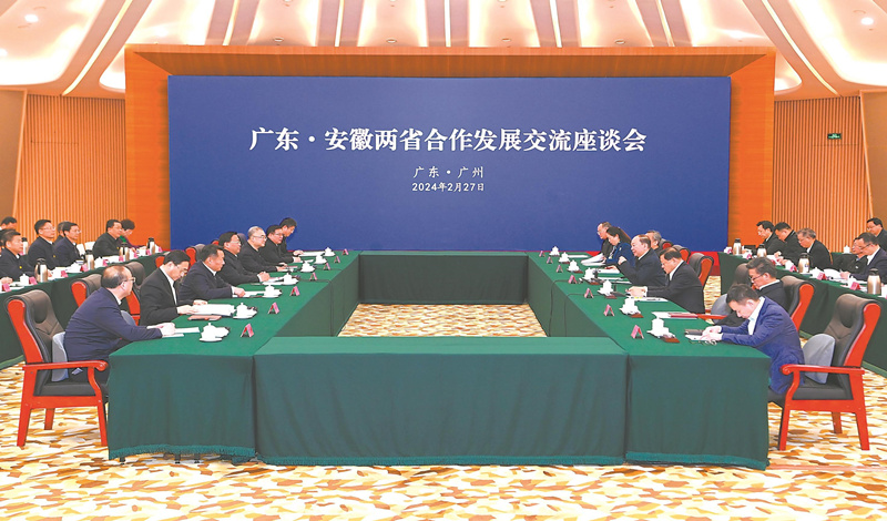 2月27日下午,广东·安徽两省合作发展交流座谈会在广州召开。记者 杨 竹 摄 (通讯员 郑言 记者 朱胜利)2月27日至28日,省委书记韩俊、省长王清宪率安徽党政代表团,就深入学习习近平总书记重要讲话重要指示精神,对接落实重大国家战...