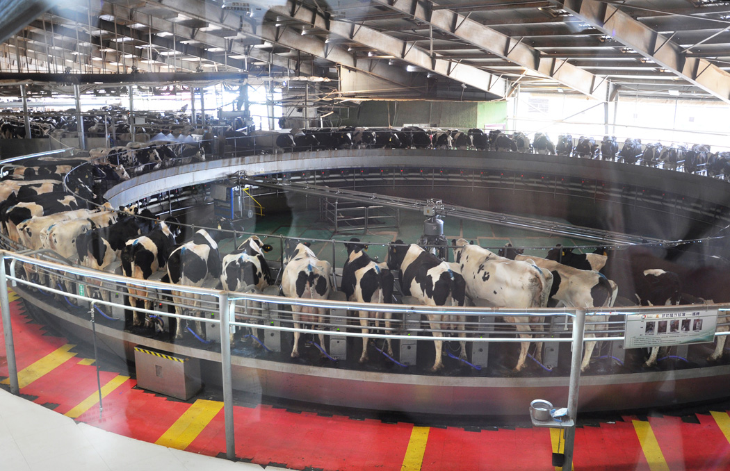 前进牧业石岗墩牧场挤奶大厅,奶牛排队依次走上挤奶转盘。
