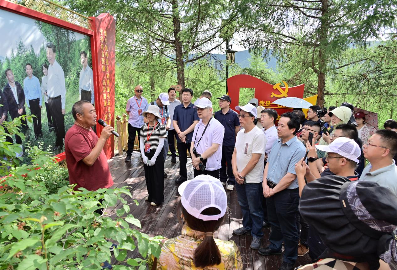 马鞍山林场副场长柴树岭向采访团讲述习近平总书记考察林场时的情景