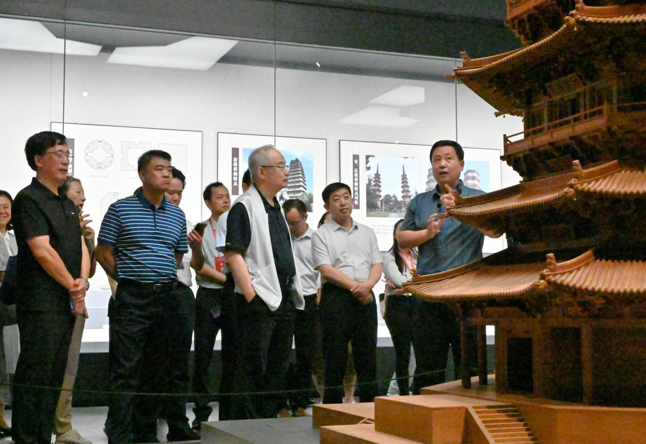 辽代历史文化博物馆馆长黄文博向采访团介绍辽塔建筑艺术。张耀东/摄