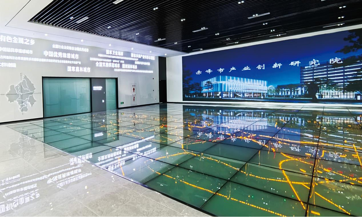 踏入赤峰市高新区规划展示馆,透过透明玻璃地砖,脚下被点亮的园区电子规划展示图颇为亮眼。